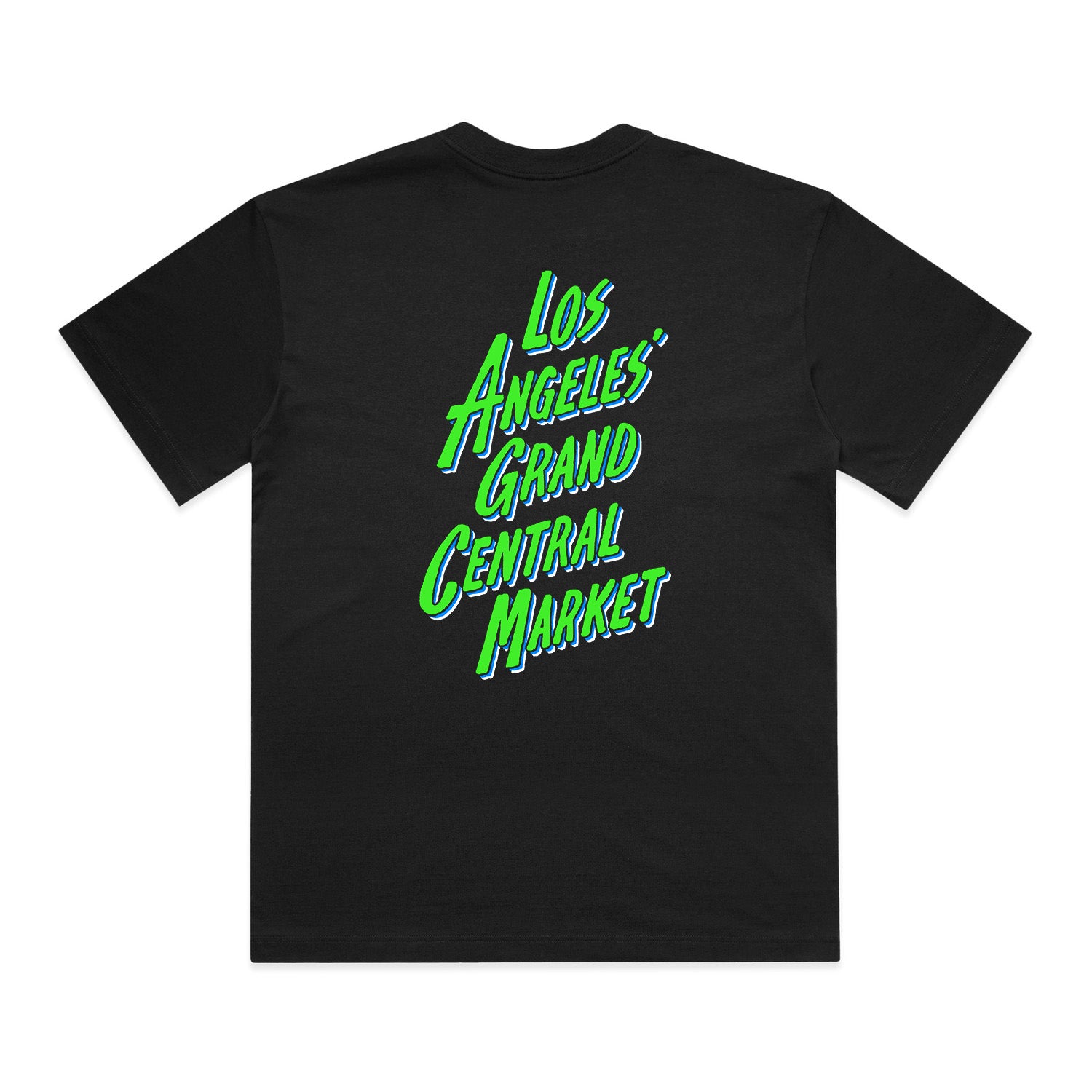 Neon green and blue graphic on black boxy t-shirt. A classically structured tee with clean lines, crew neck, and Grand Central Market custom design front and center. This shirt is a mid-weight, durable cotton that softens with each wash.